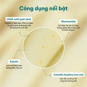 – Vitamin C: giúp làm mờ các vùng da tối màu, ngừa thâm nám, đốm nâu đồng thời cung cấp chất chống oxy hoá, dưỡng da căng mịn, sáng màu.